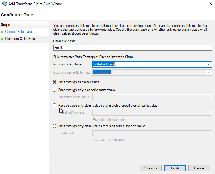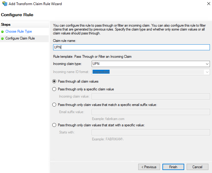 - In Select Rule Template, from the Claim rule template list, select Pass Through of Filter Incoming Claim, and then select Next.