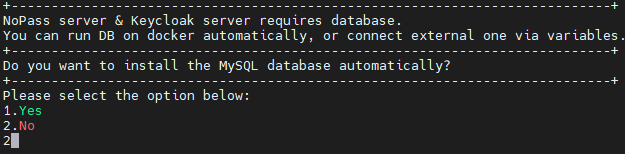 - If you have installed your external database server and you have given NoPass™ access via the variables.env file, enter "2" for "No".