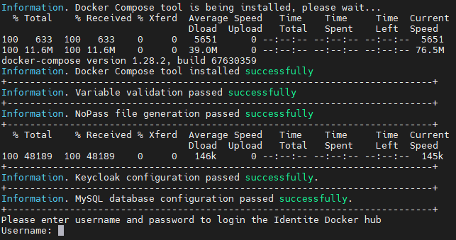 - After the docker-compose tool is installed, you will be prompted to provide credentials for the Identité® Docker Hub. This will allow you to download install the application containers.
