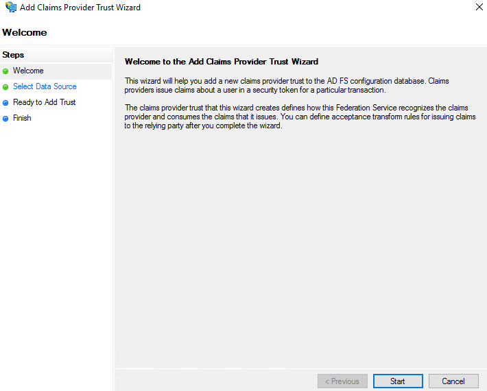 - On the right pane, select Add Claims Provider Trust to open Wizard.