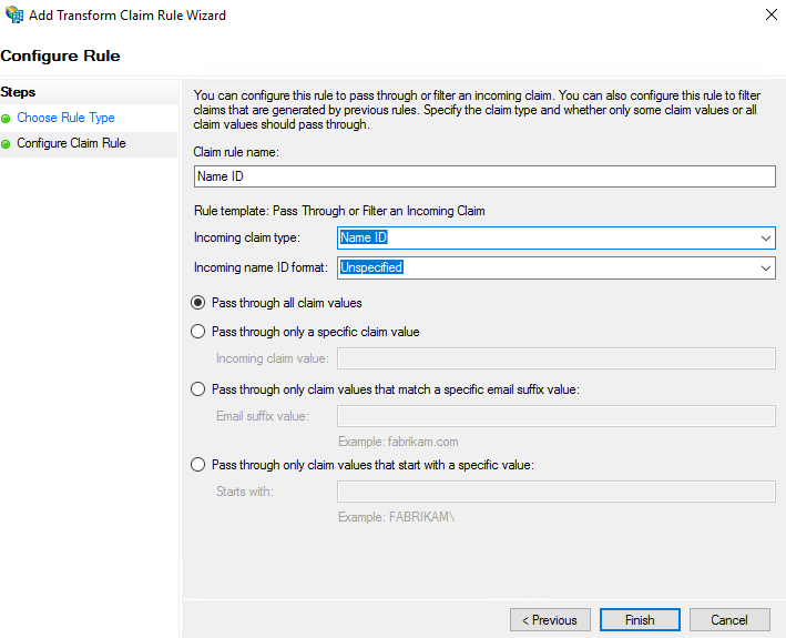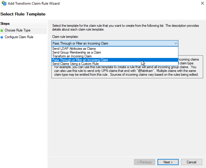 - In Select Rule Template, from the Claim rule template list, select Pass Through of Filter Incoming Claim, and then select Next.