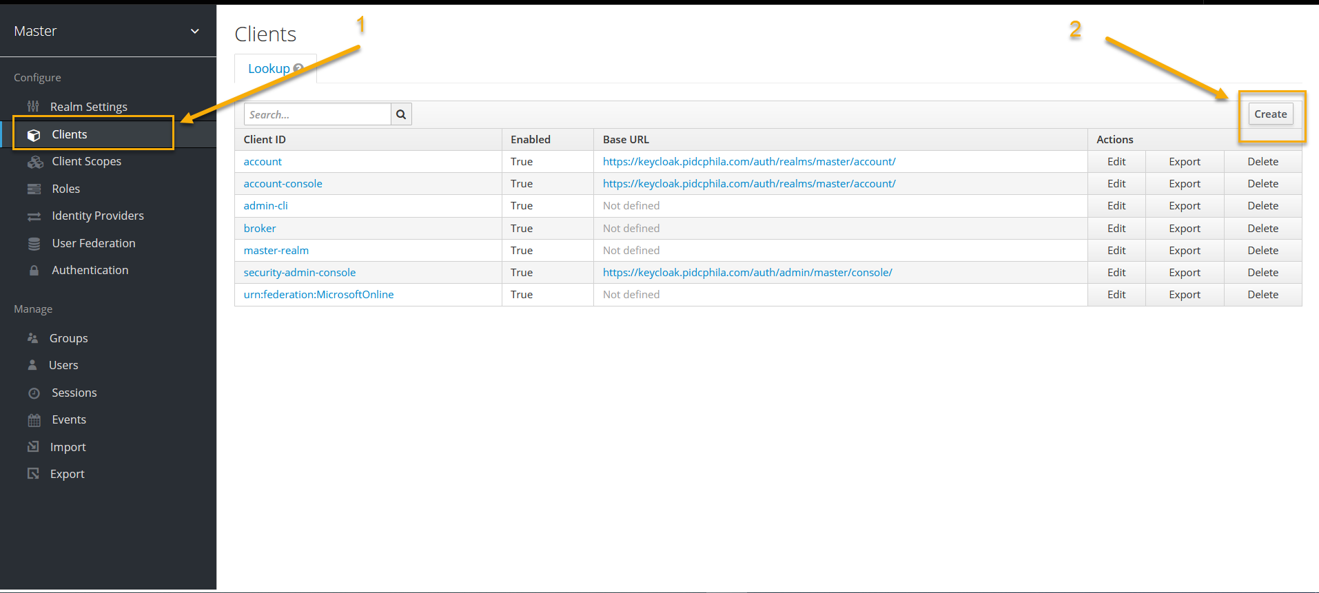 2. In the Keycloak admin console, go to your realm → the Clients tab. Click Create.