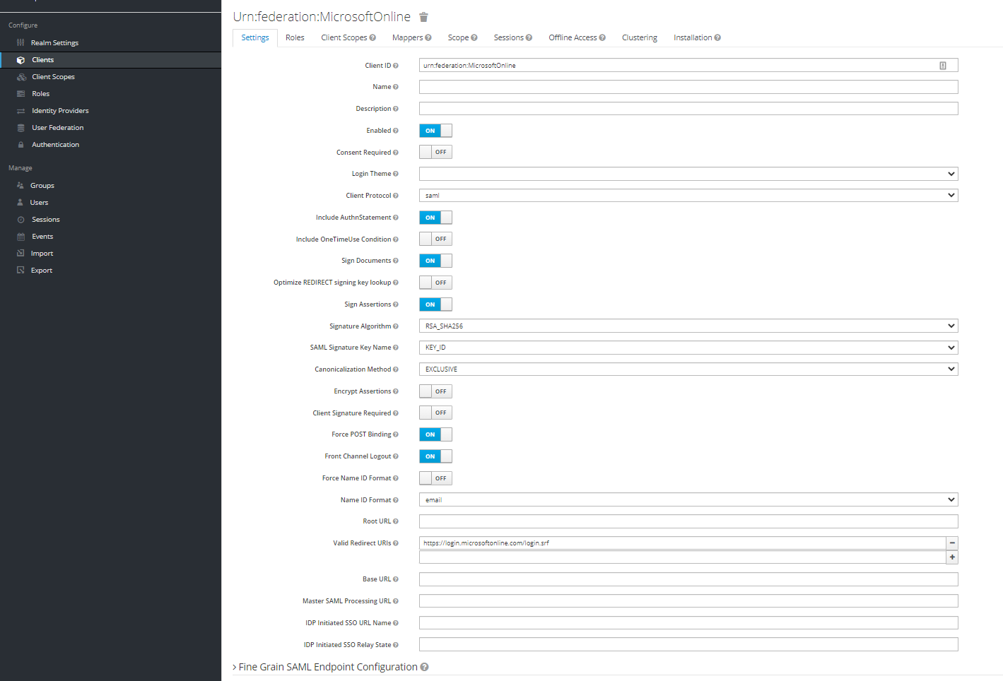 $cert="<insert here a X509Certificate from Keycloak's SAML Metadata file>" $dom = Read-Host 'What domain should be connected to Keycloak?' $issuer="https://<your.domain.com>/auth/realms/master" $ecpUrl="https://<your.domain.com>/auth/realms/master/protocol/saml" $logoffuri="https://<your.domain.com>/auth/realms/master/protocol/saml" $passivelogonuri="https://<your.domain.com>/auth/realms/master/protocol/saml" $protocol="SAMLP" Connect-MsolService Set-MsolDomainAuthentication -DomainName $dom -FederationBrandName $dom -Authentication Managed #Set-MsolDomain -Name $dom2 -IsDefault Set-MsolDomainAuthentication -DomainName $dom -FederationBrandName $dom -Authentication Federated -IssuerUri $issuer ` `-LogOffUri $logoffuri -PassiveLogOnUri $passivelogonuri -ActiveLogOnUri $ecpUrl -SigningCertificate $cert -PreferredAuthenticationProtocol $protocol Get-MsolDomain Get-MSolDomainFederationSettings -DomainName $dom | Format-List *