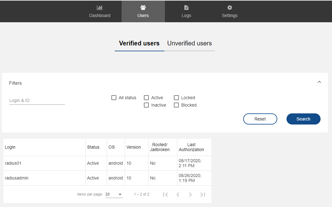 NoPass™ can proxy all connections from RADIUS services to the RADIUS server. When the user connects for the first time, the Block Unverified users check box appears in the Unverified users tab of the Admin console.