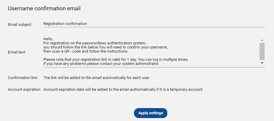 - In the Username confirmation email group, set Email subject, Email text, Confirmation link, and Account expiration values.