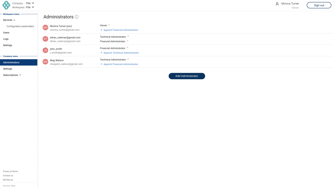 1. To delegate your Owner role, go to Administrators in the NoPass™ Admin Console.